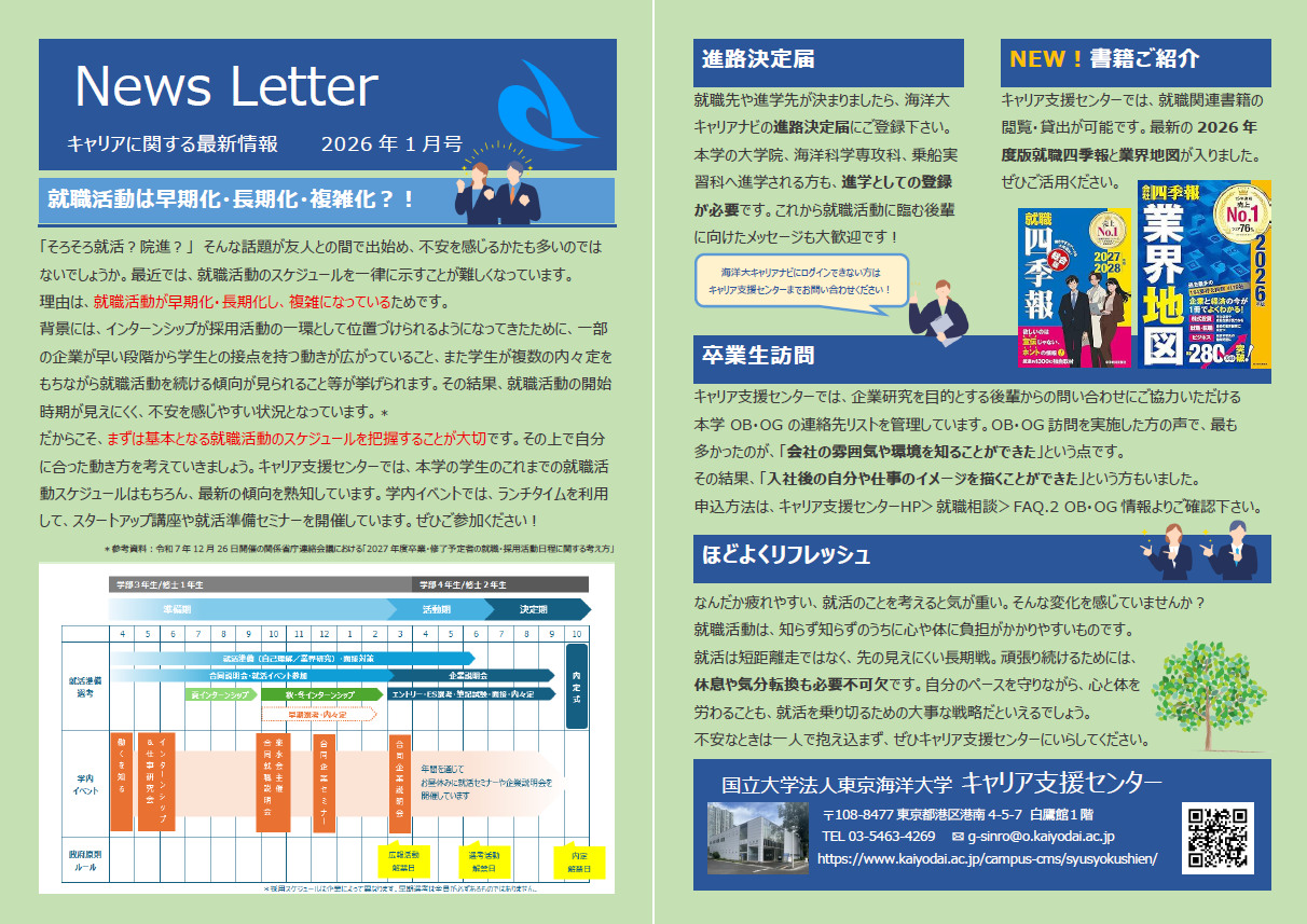 刊行物 News Letter 2026年1月号 発行 2026.02.12 画像を押すと拡大します お問合せはキャリア支援センターまでg-sinro[a]o.kaiyodai.ac.jp([a]を@にしてお送りください)