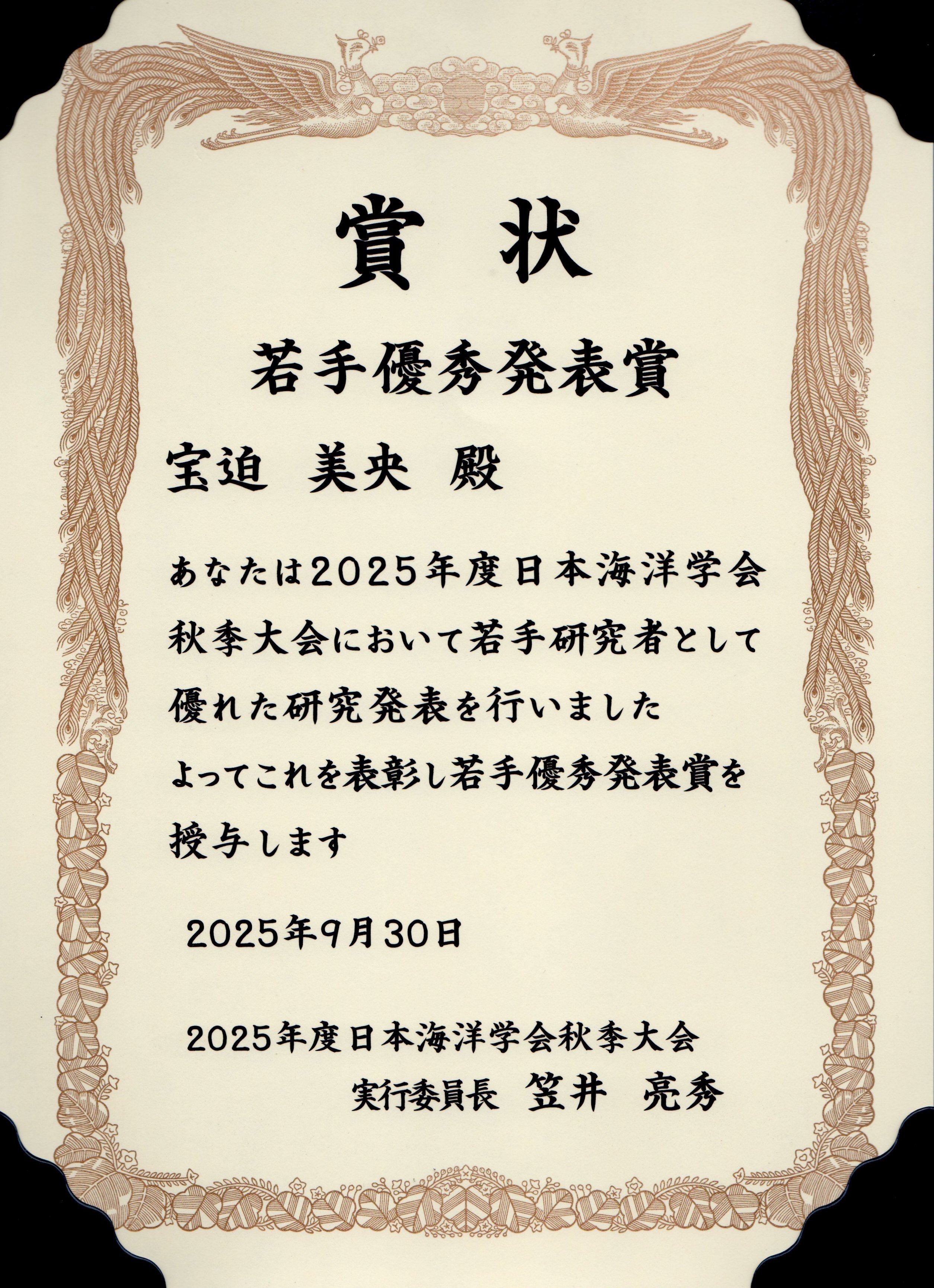 【受賞・表彰】宝迫美央さん(修士1年)が、2025年度日本海洋学会秋季大会において若手優秀発表賞を受賞しました。