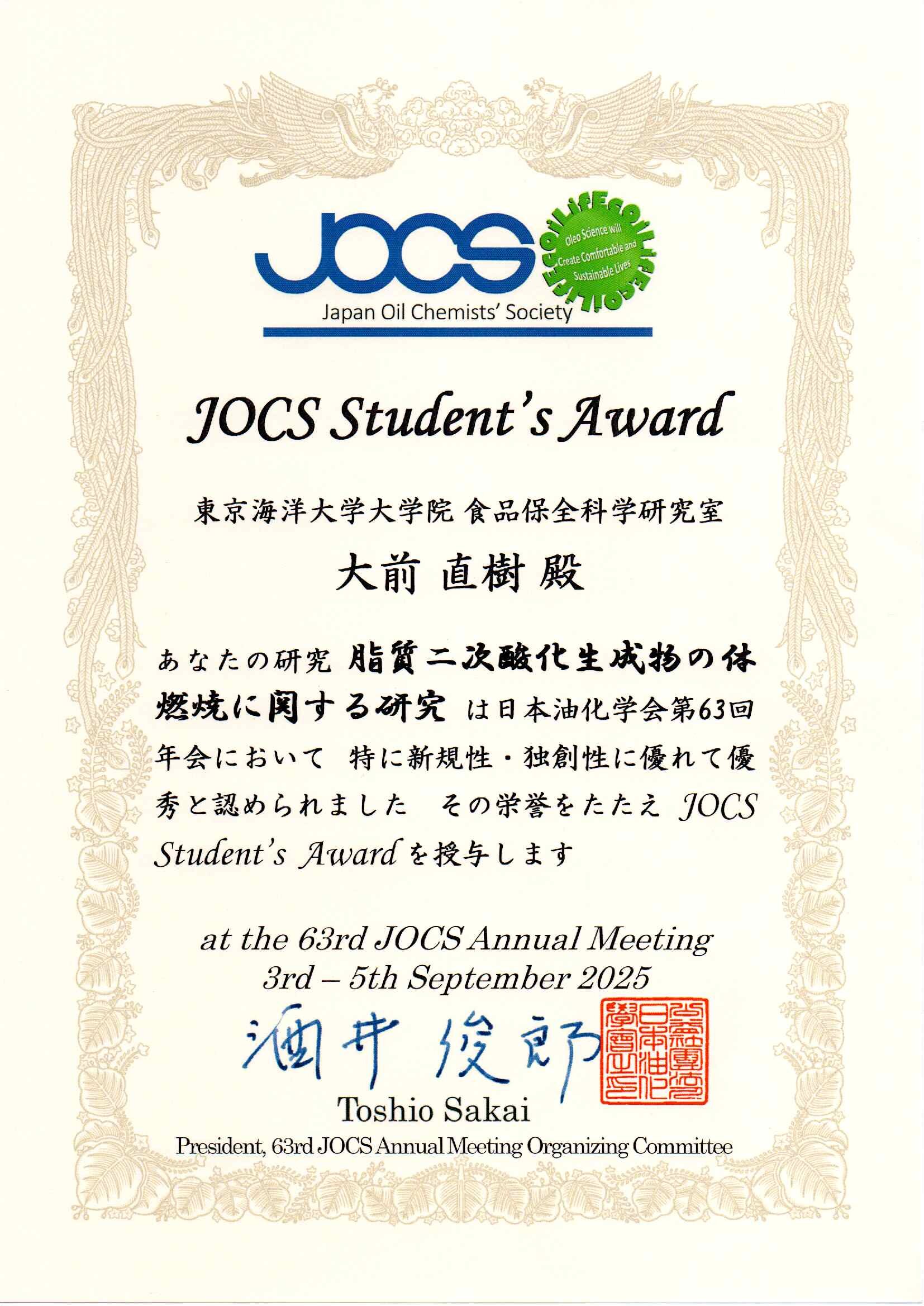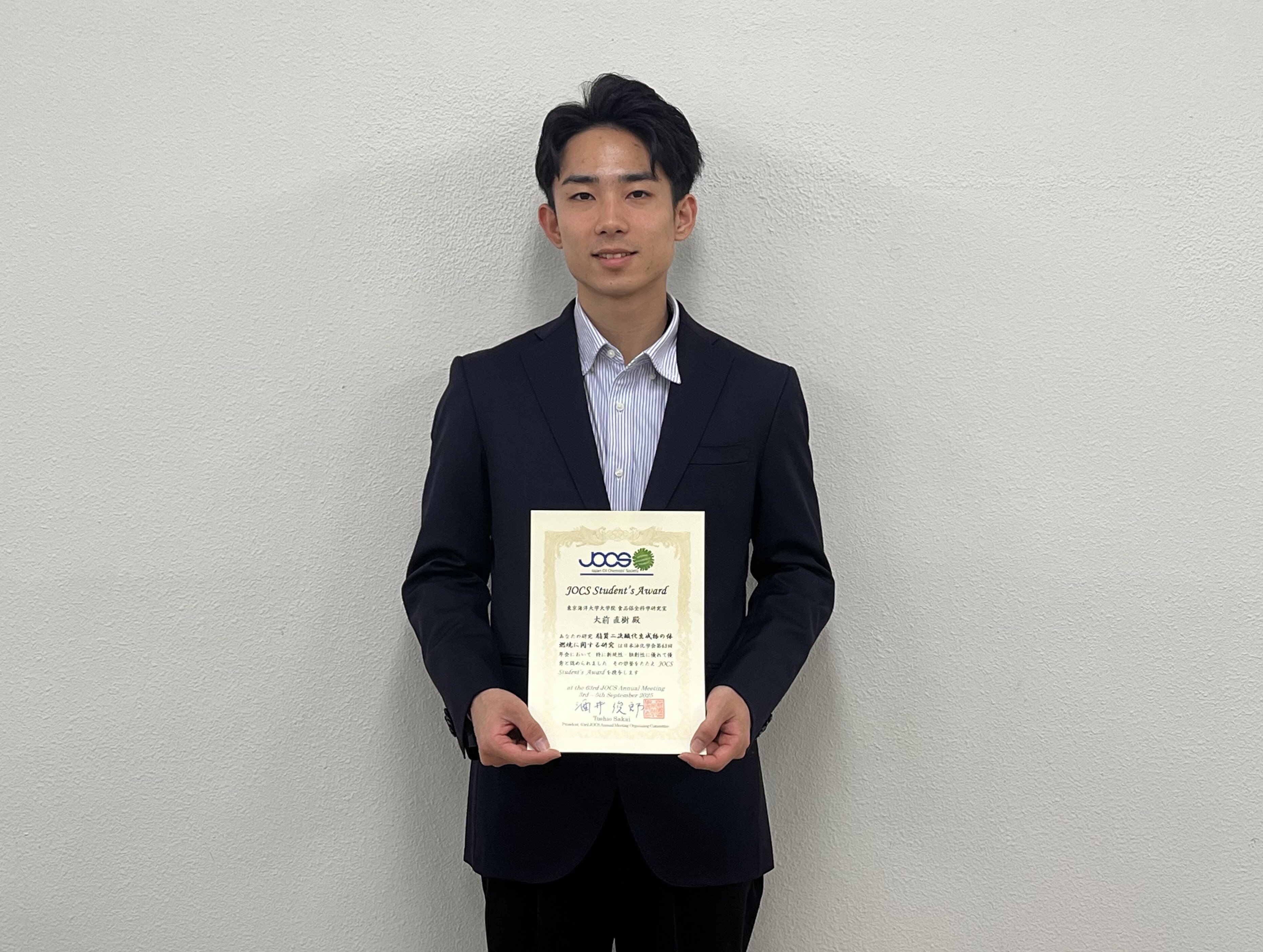 2025年9月3日~5日に長野県・長野市で開催された、第63回日本油化学会年会において、本学大学院学生の大前直樹さんが学生奨励賞(JOCS Student's Award)を受賞しました。