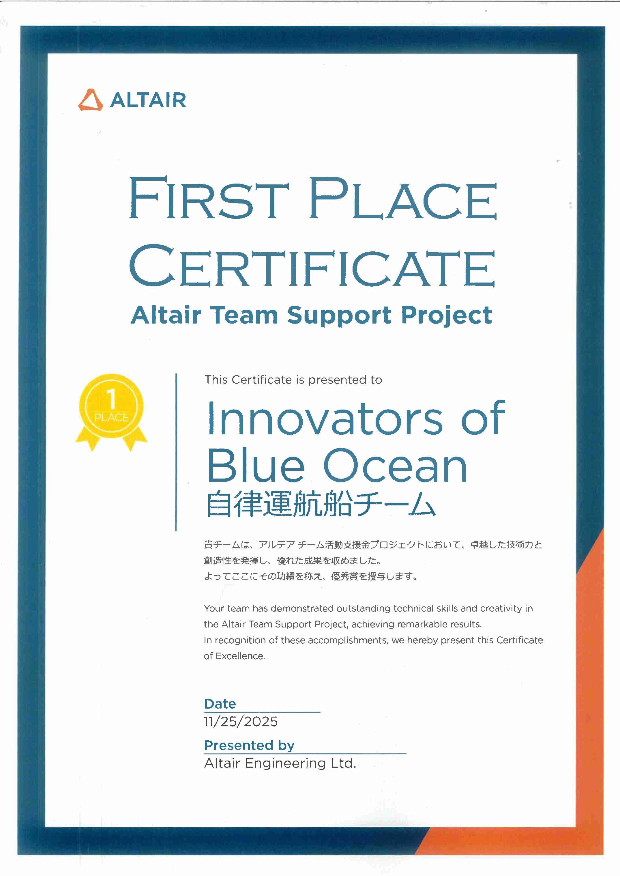 小型自律船 Autonomous Surface Vessel(ASV)を設計・製作し競技を行う国際コンペティションNjord Challengeに参加しました。開発過程で、CAEベンダーであるAltair社のチーム活動支援プロジェクトに申し込み、プロジェクト内の最優秀活用事例としてAltair社から表彰を頂きました。チームは東京大学(1名)、東京海洋大学(2名)、大阪公立大学(3名)の計6名で構成され、私たちは電装部の設計製作を担いました。コンペティション本番は安全性等の事前審査を3位で通過したものの、準備不足やトラブルから競技の完走には至りませんでした。しかし、学生主体でチームを結成しゼロから機体開発を行った点、その際にAltair社のツールを複数用いた点が評価され、今回の受賞に至りました。