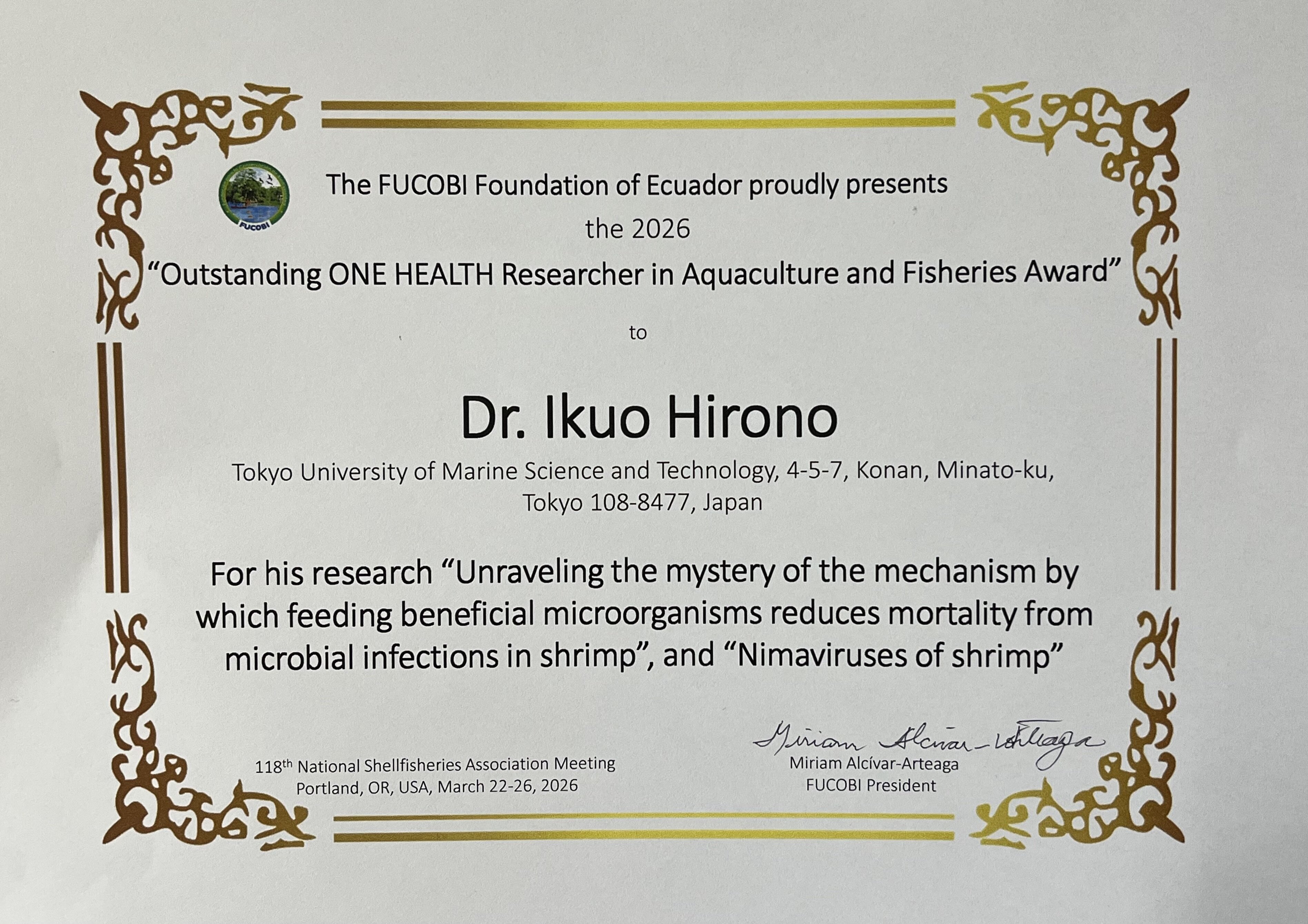 廣野育生教授がFOCOBI FoundationよりOutstanding ONE HEALTH Researcher in Aquaculture and Fisheries Awardを受賞しました。