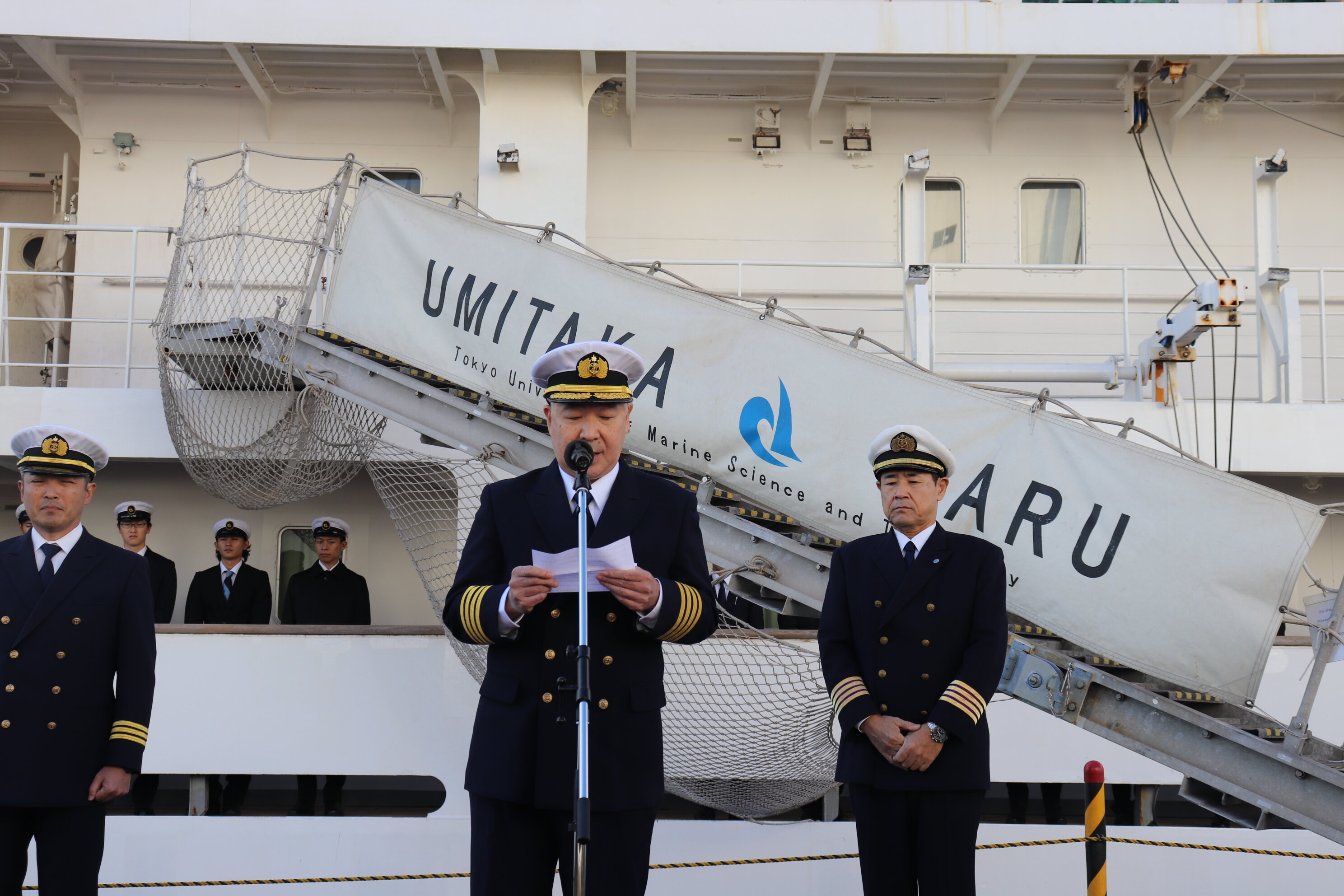 出港式では、航海に参加する海洋科学専攻科学生34名が海鷹丸船上のデッキに並び、井関俊夫学長の挨拶に続いて、文部科学省研究開発局海洋地球課の三宅隆悟課長、大学共同利用機関法人 情報・システム研究機構 国立極地研究所の野木義史所長にご挨拶をいただき、最後に、海鷹丸宮崎唯史船長が出港の挨拶を述べられました。出港式閉式後、ご家族や式典出席者に見送られる中、海鷹丸は約3ヶ月に渡る長期航海へと出航しました。