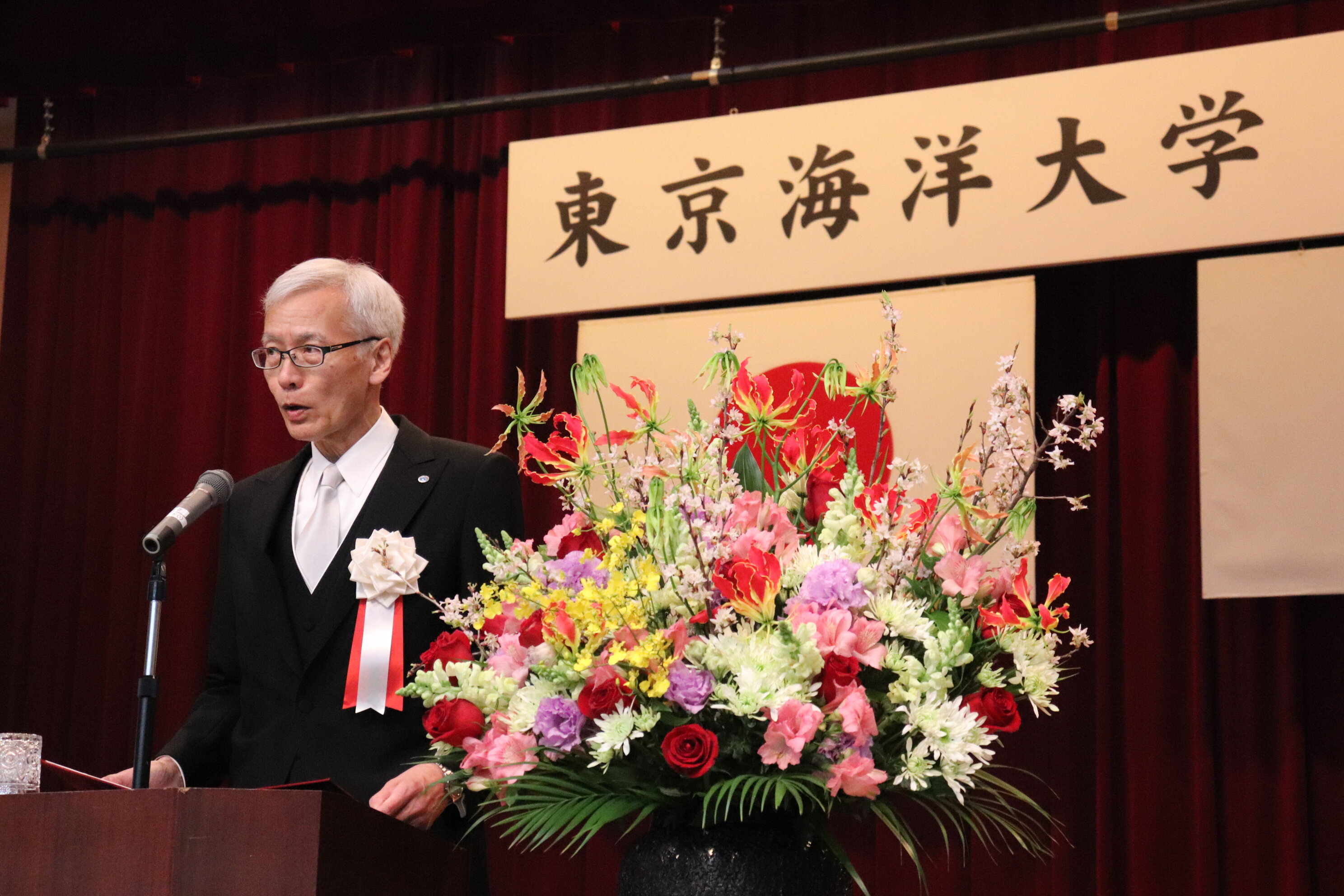 井関学⻑の式辞全⽂は、こちらからご覧ください。また、入学生へ向けたお祝いメッセージとして、本学(旧東京水産大学)出身の小野寺五典衆議院議員、楽水会の松本会長および海洋会の関根会長からご祝辞をいただきました。また、本学客員教授のさかなクンから、メッセージ動画をいただいておりますので、あわせてご覧ください。