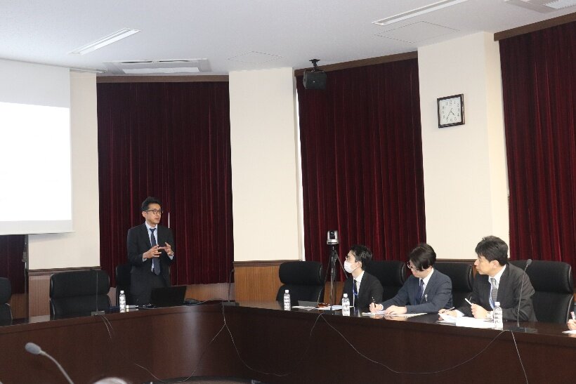視察の冒頭では、井関俊夫学長をはじめとする本学執行部より、本学が進めている教育・研究体制強化の取組や水圏生物生産工学研究所で行っている先端的な研究活動、また、土地の有効活用事業等について概要説明を受けた後、それらの取組について種々意見交換を行いました。