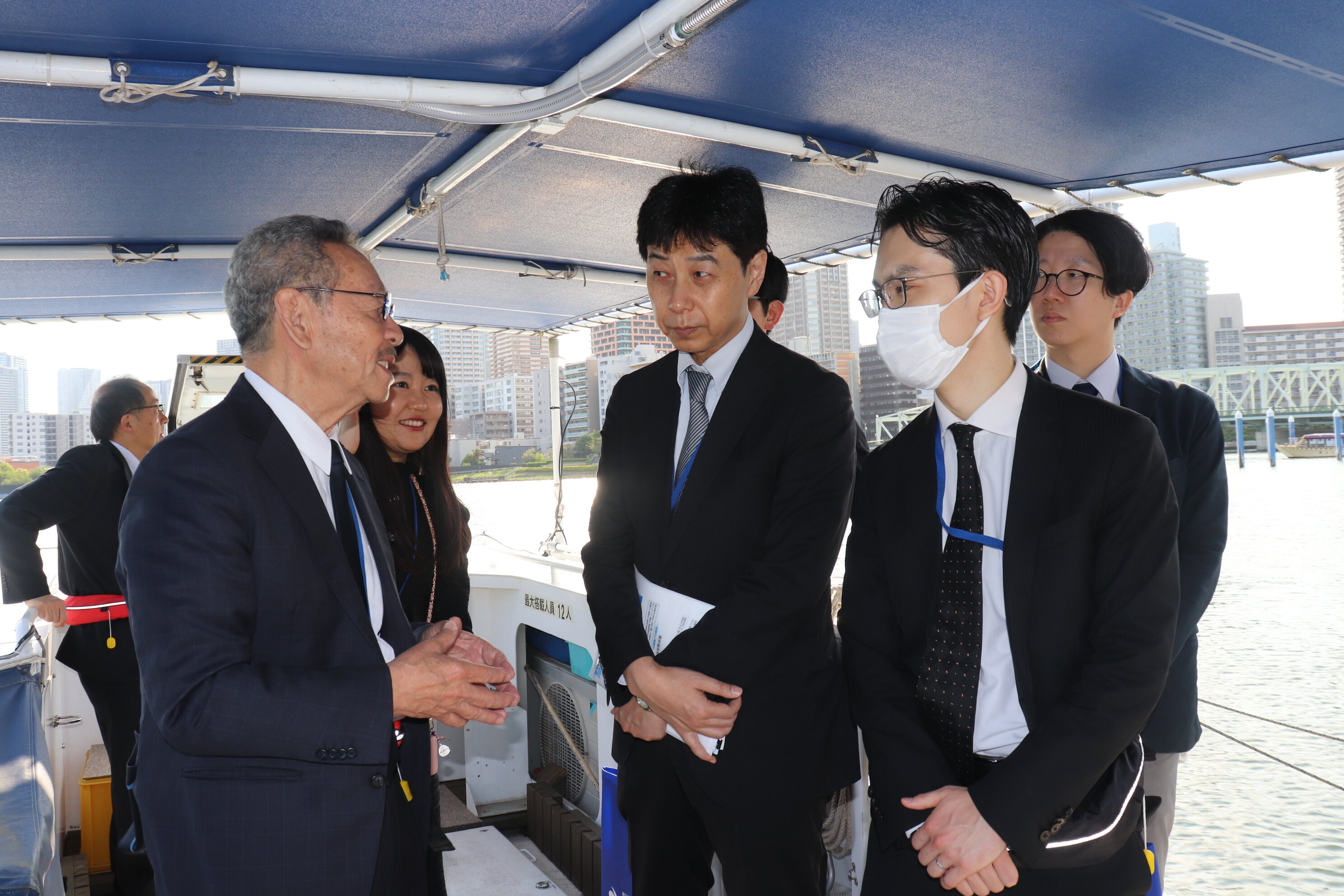 その後、品川キャンパスで実際に水圏生物生産工学研究所を見学し、矢澤良輔教授より代理親魚技法について説明を受けました。また、この4月から開設した国際混住寮「青鷹寮」を視察した後、越中島キャンパスへ移動し、本学が開発した水素燃料電池船「らいちょうN」に乗船視察した後、本学に新たに設置した「次世代船舶運用技術開発センター」について説明を受けました。